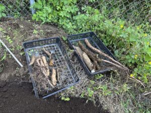 7月、8月は暑さのために休会だったため、今回は3か月ぶりの開催で、来月以降の作業の説明を受けた後、だいぶ以前に植えた、長いもの収穫を行いました。だいぶ、深くまで掘り出す必要があったため、収穫量は多くありませんでしたが、立派な長いもが出てきました。来年の春はFさんの指導のもと、栽培をしていきたいと思います。